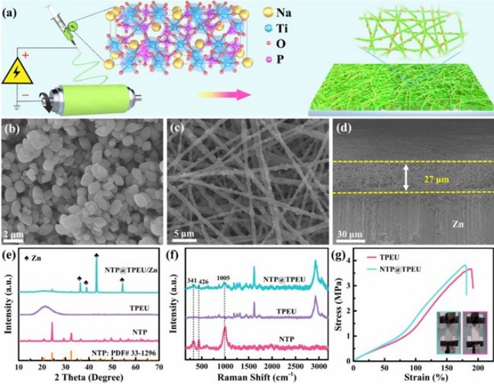 水系锌离子电池具有安全性好、天然丰度高和成本低等优点,在下一代储能领域有巨大的应用前景。然而,锌金属在水中引发的“尖端效应”会导致枝晶生长、析氢反应以及其它寄生反应,这些问题对水系锌离子电池的库仑效率、锌负极的利用率和循环寿命造成了严重影响。我校与中科院苏州纳米所联合攻关,提出了一种在锌表面构筑具有协同作用的高弹性体和超离子导体3D复合纤维用于锌负极保护的策略。利用该保护层可调和锌沉积时的空间变化,抑制“尖端效应”产生,大幅提升水系锌离子电池的性能。