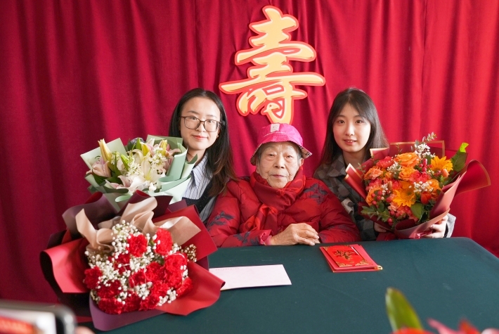 现场气氛热烈欢快。祝尔纯亲属感谢学校对老人的关心和照顾。我校“忠诠-尔纯思想政治教育奖”获奖教师和学生代表向祝老赠送鲜花,衷心祝愿老人福寿绵长、幸福安康。