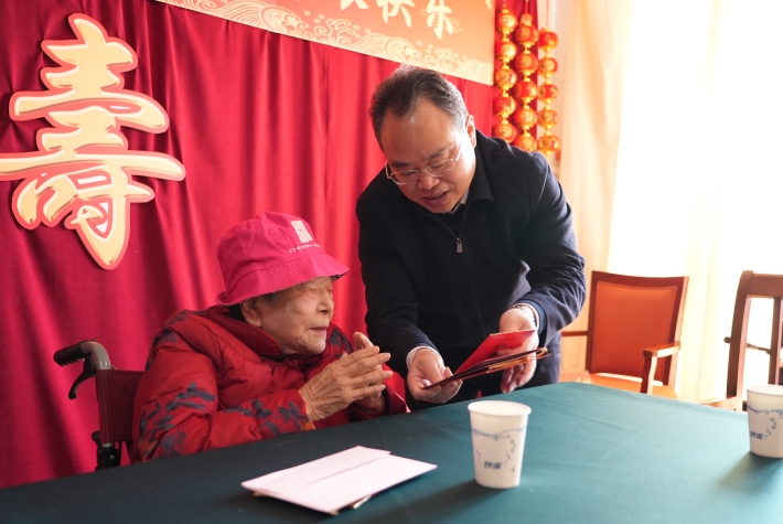 郭庆松与祝尔纯先生亲切交谈,代表全校师生祝贺祝老百岁生日,感谢祝老以信仰的力量支持党的教育事业和播撒人间大爱,构筑起上应校园的一座精神丰碑。郭庆松感谢上级党委对我校离退休老同志的关心,向祝老亲属和护理人员详细了解其生活起居和健康状况,感谢他们对祝尔纯先生的悉心照料。郭庆松表示,祝尔纯先生是学校宝贵的精神财富,在即将迎来建校70周年华诞之际,衷心感谢老一辈教育工作者为学校发展奠定的坚实基础和做出的积极贡献,学校将一如既往地关心离退休老同志生活,祝愿全体老同志生活顺心如意、安享幸福晚年。