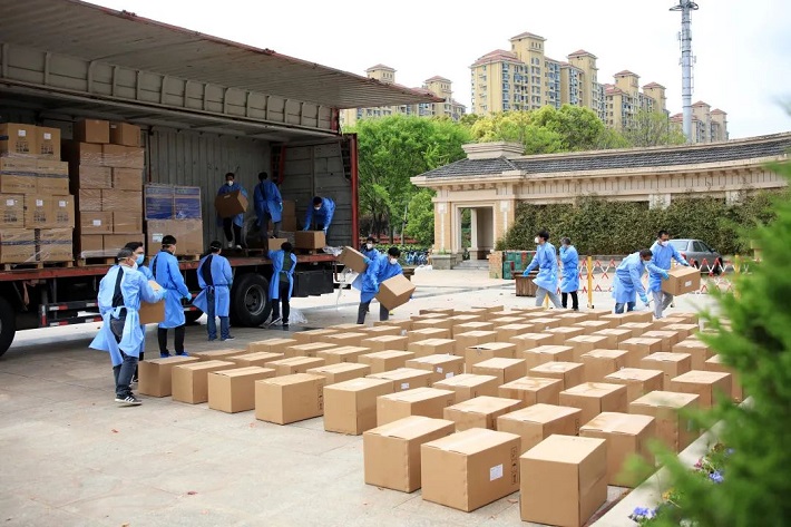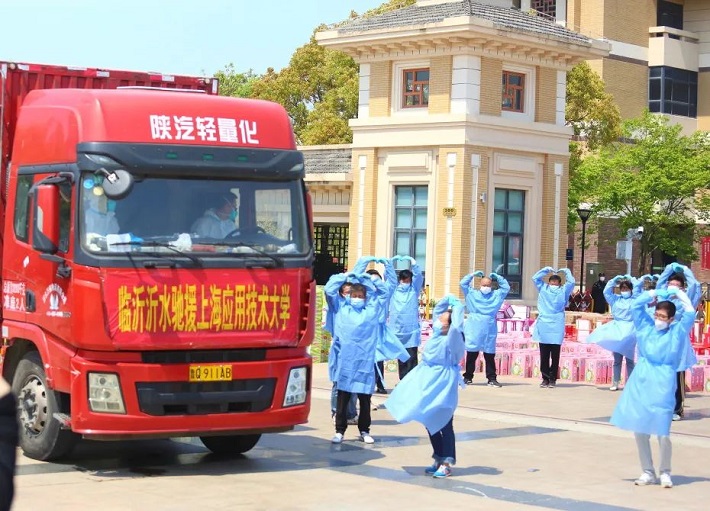 4月12日早晨,搭载着上千件爱心抗疫物资的鲁Q大货车,经过700多公里的长途跋涉,抵达奉贤校区。数以千计的饼干、奶酪、粥品等物资,是山东沂水县人民从千里之外星夜兼程送来的关怀与支持!