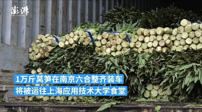 3月25日晚,载满10000斤新鲜莴笋的大卡车从南京六合抵达奉贤校区。这批蔬菜是上海肤徕生物高科技有限公司的爱心捐赠,有效缓解了学校蔬菜保供压力。