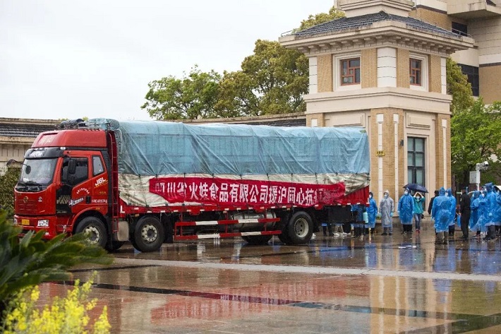 一袋袋沉甸甸的当季蔬菜、时令水果、调料包……4月13日,来自四川省火娃食品有限公司捐赠的物资安全抵达上海应用技术大学。