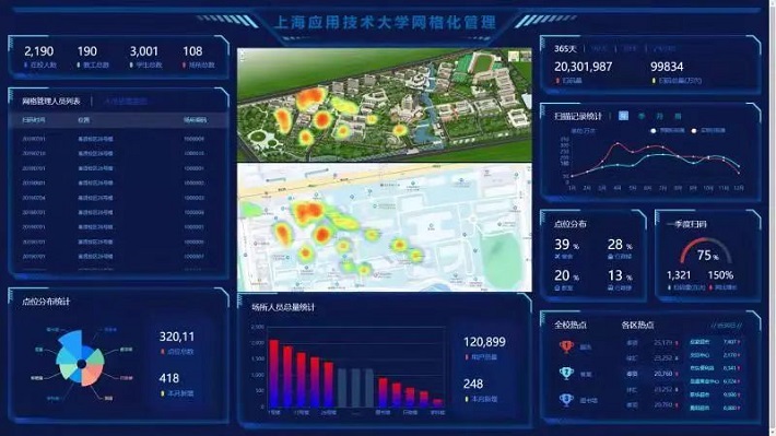 系统开发以楼宇为单位,对奉贤校区48幢(含办公、教学、食堂等)、徐汇校区19幢楼宇进行数字化监控,采用移动校园APP端+微信小程序+后台管理 +实时大数据分析可视化大屏相结合的技术手段,掌握师生员工动态轨迹,实时写入后台大数据,自动生成统计分析结果和热力图。