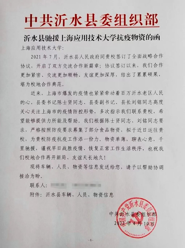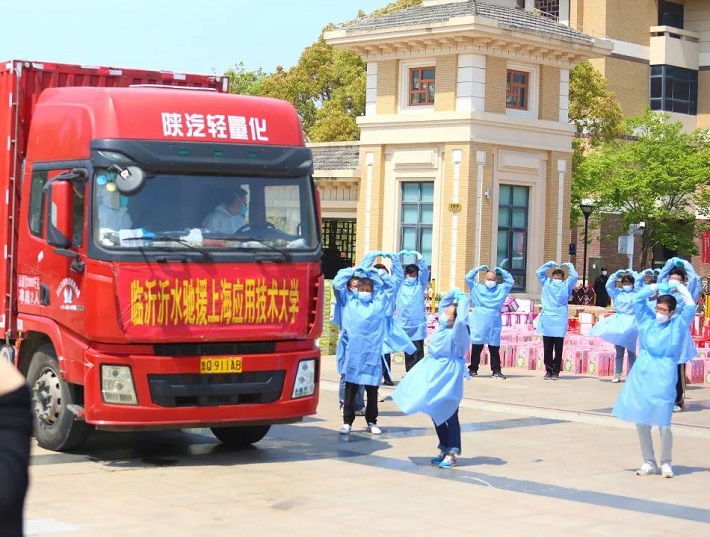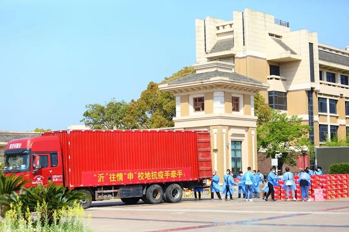 在上海疫情防控阻击战的关键时刻、在我校勠力同心战疫情的紧张关头,山东沂水县委、县政府高度关注我校全体师生状况,紧急采购各类物资,于4月10日派专车启程运往上海。在疫情防控最吃劲阶段,沂水县人民让我校师生体会到校地双方团结合作、共克时艰的真挚情谊与守望相助。