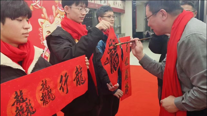 汪小帆为“祥龙”添上点睛之笔,浮云惊龙,万象新生,祝福学校事业越来越好,祝福师生平安康健。师生们用一幅幅春联、福字和年画表达迎接新年的喜悦。
