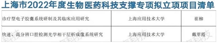 近日,上海市科学技术委员会公布了2022年度“科技创新行动计划”生物医药科技支撑专项立项项目名单,我校理学院戴翠霞教授领衔的科研团队申报的《快速、高分辨口腔检测光学相干层析成像系统研究》和计算机科学与信息工程学院教师崔柳申报的《诊疗型电子胶囊系统研制及其临床应用研究》2个项目获批立项。