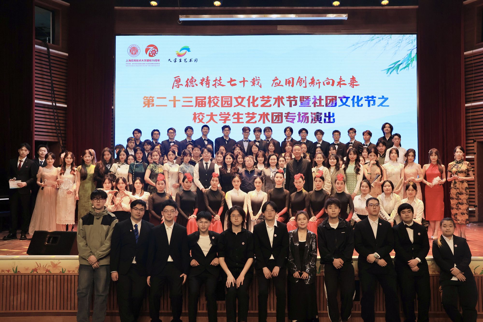 为庆祝建校70周年,增强爱校情怀,4月18日,“厚德精技七十载 应用创新向未来”校庆系列活动之校大学生艺术团专场演出在校上演。校党委副书记、副校长王瑛,党委学生工作部部长、人民武装部部长、学生处处长袁翔,校大学生艺术团艺术指导李建民,校团委副书记魏晋,300余名师生共同观赏整场演出。