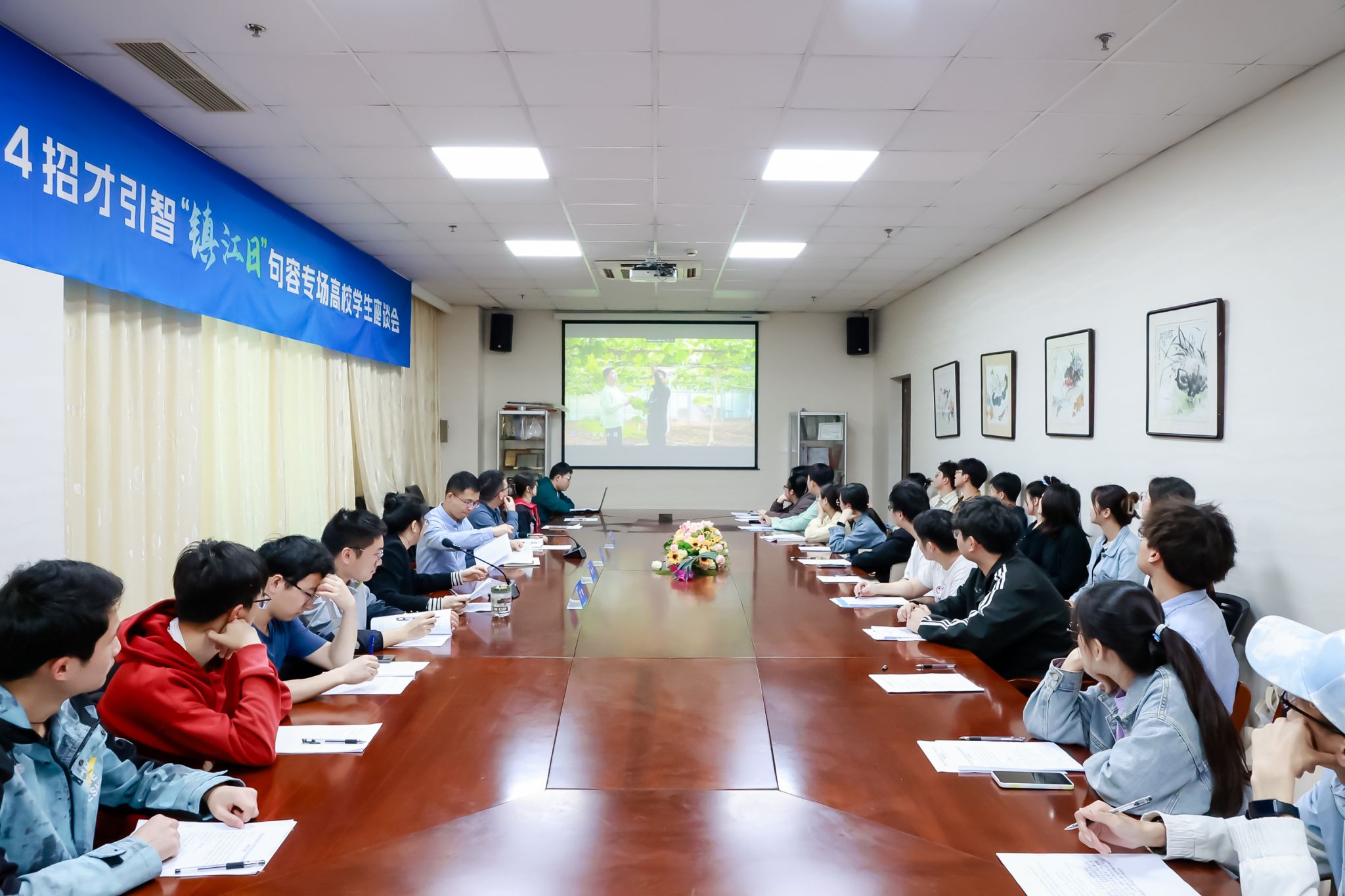 镇江市、句容市相关领导介绍了镇江市人才政策和人才需求及句容市创新创业发展环境。学校2022届校友黄士源分享了在镇江的工作感想。
