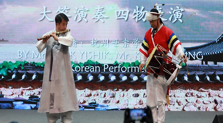 闭幕式还上演了精彩的节目。优美的《芭蕾》舞蹈惊艳开场,通过视频呈现了国际文化周期间举办的各类活动的精彩瞬间。中英两国教授以“未来教育”为主题进行了精彩的演讲。留学生的一曲中文歌曲《我们不一样》充满正能量,饱含中国力量的《太极拳表演》和韩国传统艺术表演《四物表演》将中韩两国优秀传统文化完美诠释。