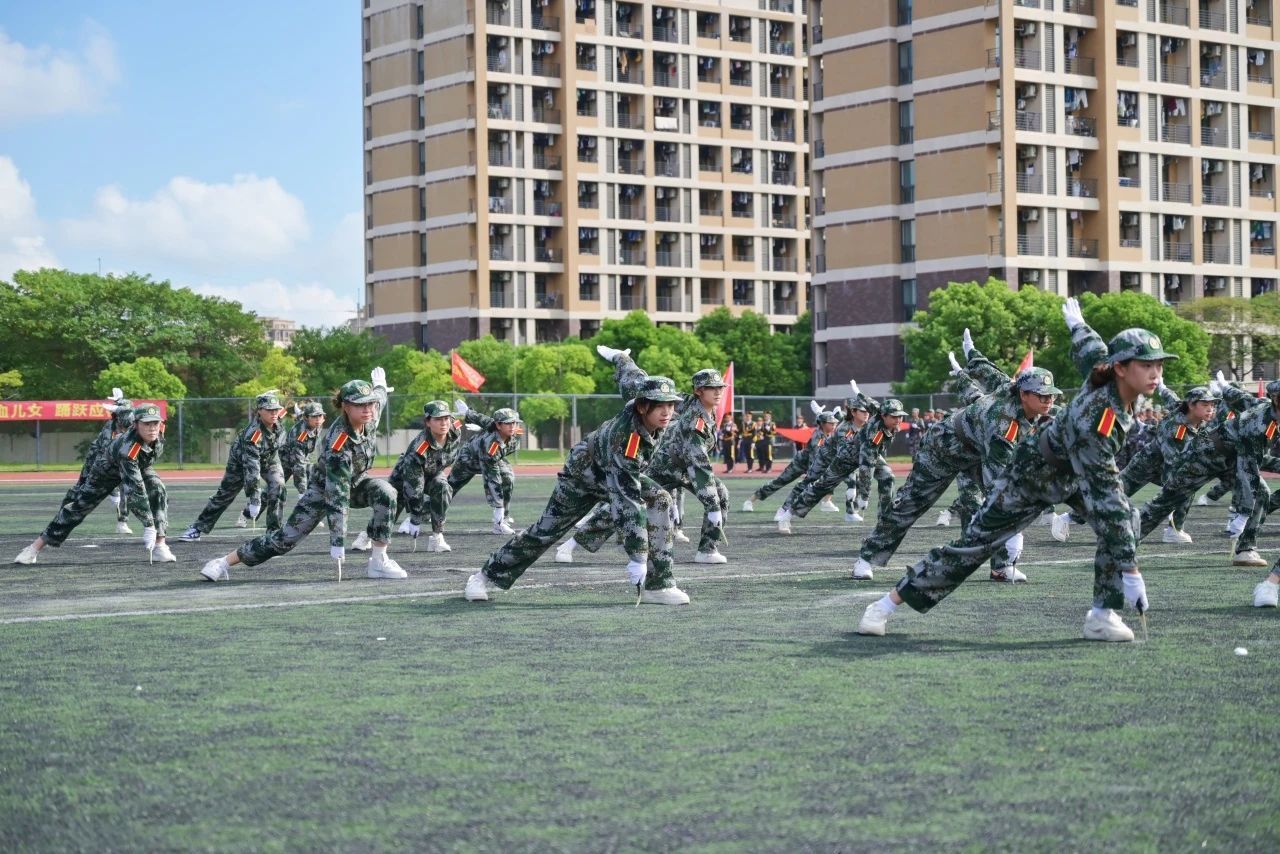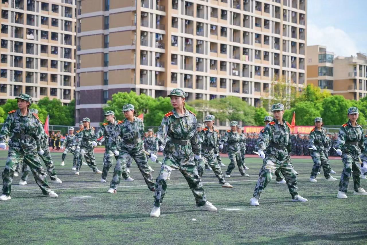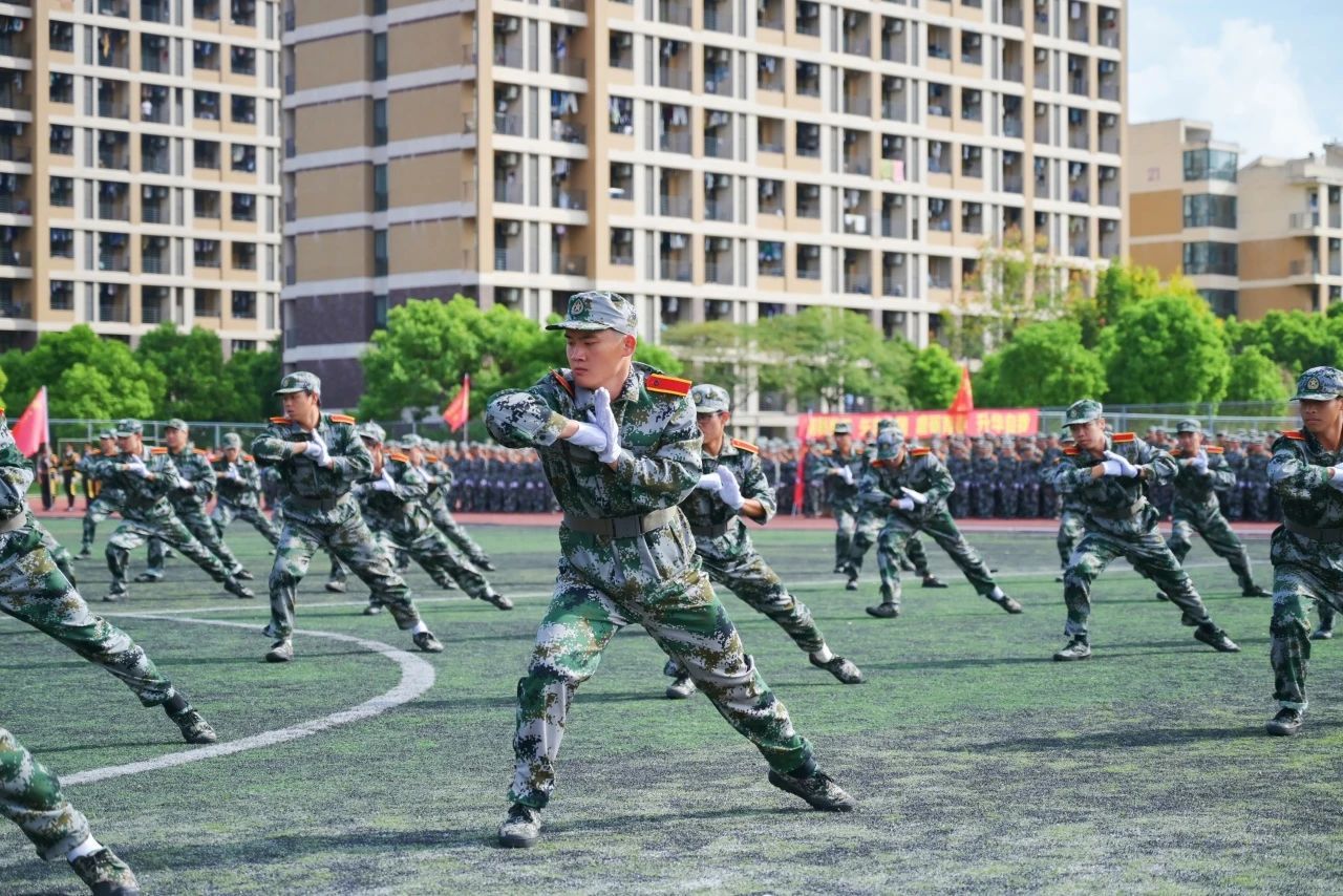 由各连女生组成的匕首操方阵,手持利刃,势如劈竹,刚柔相济,坚韧有力,尽展巾帼不让须眉,一招一式刚柔并济,清脆呐喊响彻云霄。