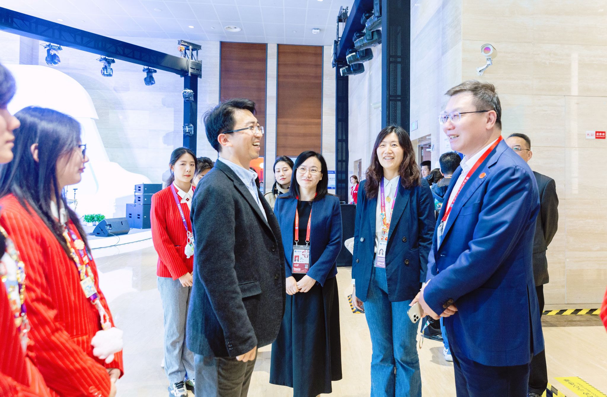 11月7日,校长汪小帆,校党委副书记、副校长王瑛来到国家会展中心,看望慰问服务第七届进博会的上应“小叶子”们,为志愿者们加油鼓劲,并同团市委副书记王江、团市委挂职副书记唐志宇亲切交谈。