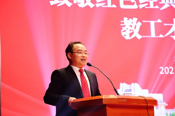 郭庆松表示,在全党深入开展党史学习教育、学习贯彻党的十九届六中全会精神之际,我们欢聚一堂,共同欣赏“致敬红色经典 绽放上应风采”上应大教工才艺大赛,老师们充满活力而又精彩的演出让大家心潮澎湃。郭庆松指出,大赛是校健康文化节活动之一,展示了我校教职工爱生活、爱健康、充满活力的精神风貌,这正是对《“健康中国2030”》规划纲要很好的呼应,有助于促进教职工强身健体、培养健康兴趣爱好、增进相互友谊、共享健康校园文化生活。希望广大上应人共同行动起来,积极锻炼、努力工作,为推进高水平应用创新型大学建设做出新的贡献!