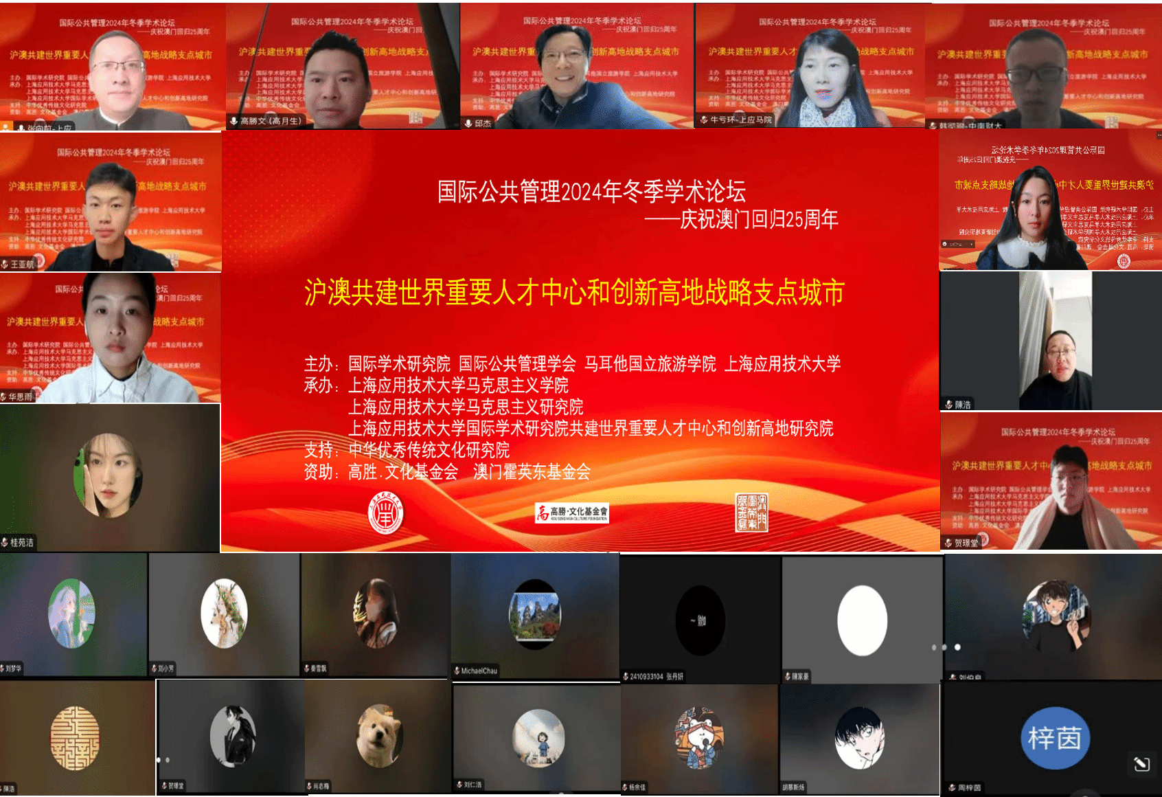 日前,由国际学术研究院、国际公共管理学会、马耳他国立旅游学院、上海应用技术大学主办,上海应用技术大学马克思主义学院、马克思主义研究院、上海应用技术大学—国际学术研究院共建世界重要人才中心和创新高地研究院承办,上海应用技术大学中华优秀传统文化研究院、学研出版社、《经济管理学刊》支持,国家外国专家项目基金、澳门霍英东基金会、高胜・文化基金会资助的国际公共管理2024冬季学术论坛圆满落幕。此次论坛为庆祝澳门回归25周年专场,主题为“沪澳共建世界重要人才中心和创新高地战略支点城市”,多名专家、学者、研究员参与,研究成果将助力世界重要人才中心与创新高地高质量发展。