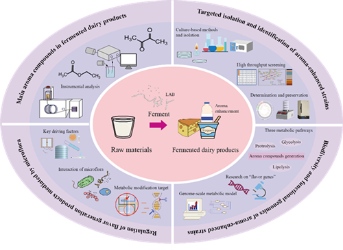 “Flavor optimization in dairy fermentation: From strain screening and metabolic diversity to aroma regulation”,田怀香教授为论文第一作者,陈臣教授和娄新曼副教授为共同通讯作者。该文综述了发酵乳制品中风味与微生物之间的关联性以及相关“风味”基因的鉴定,通过分析多种驱动因素,调节发酵微生物的产香性能,为微生物内源产香在发酵食品中的应用提供理论依据和技术支持。