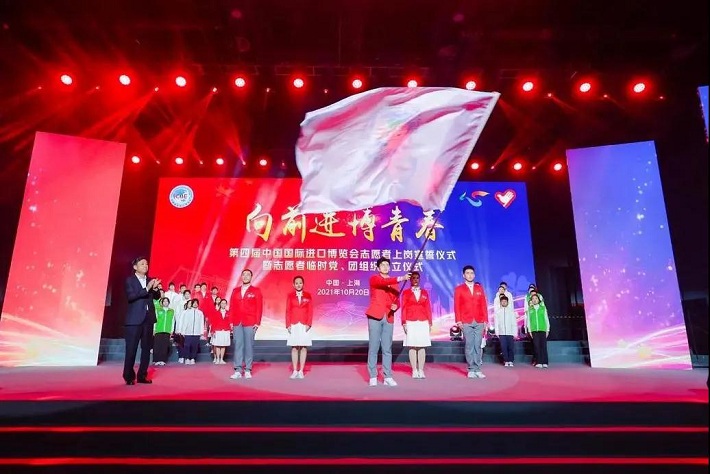 10月20日,“向前进·博青春”第四届中国国际进口博览会志愿者上岗宣誓仪式暨志愿者临时党、团组织成立仪式在国家会展中心(上海)虹馆举行。