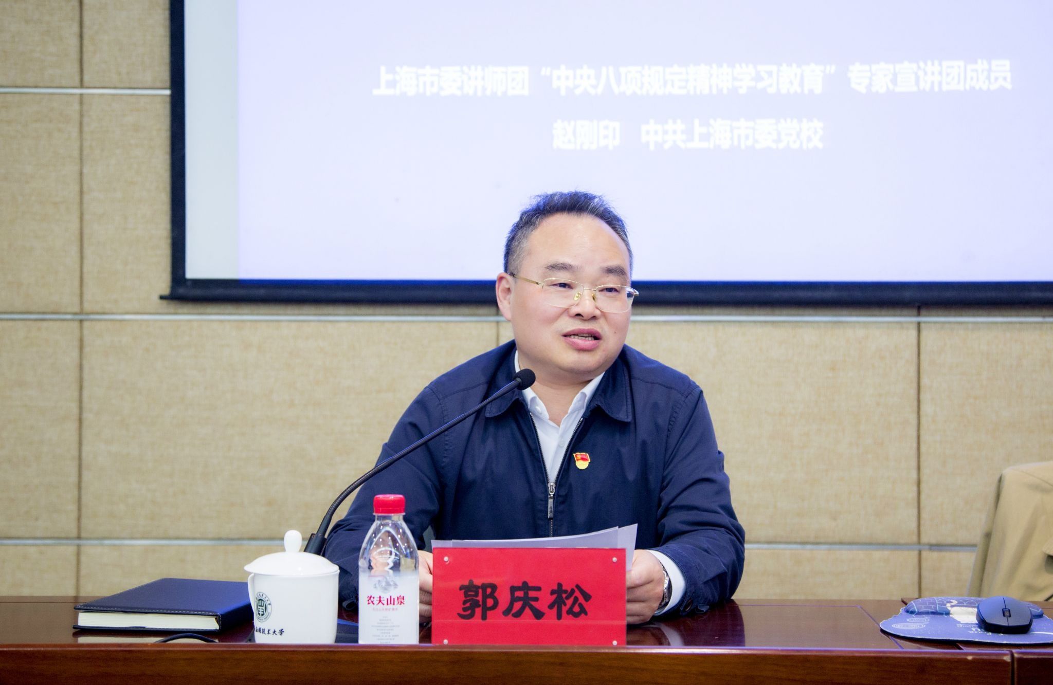 按照学校党委关于深入贯彻中央八项规定精神学习教育的整体部署和校党委理论学习中心组的学习安排,5月8日,学校党委召开党委理论学习中心组(扩大)学习会,邀请中共上海市委党校党的建设教研部主任赵刚印教授作专题辅导报告。校党委书记、党委理论学习中心组组长郭庆松主持学习会。校长汪小帆,校党委副书记、副校长王瑛,校党委副书记陈海瑾,校党委副书记、纪委书记李健,校党委常委、宣传部长杨明出席。
