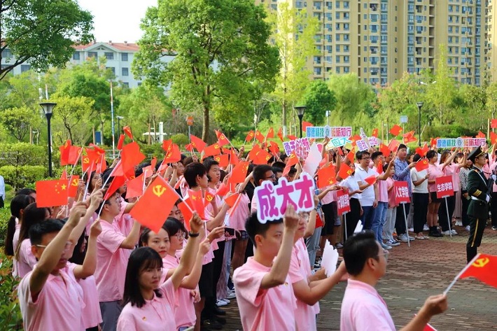 “共产党辛劳为民族,共产党他一心救中国,……没有共产党就没有新中国。”全场师生们挥舞手中的国旗,齐声高唱《没有共产党就没有新中国》,唱响爱国爱党之情、抒发报国强国之志。