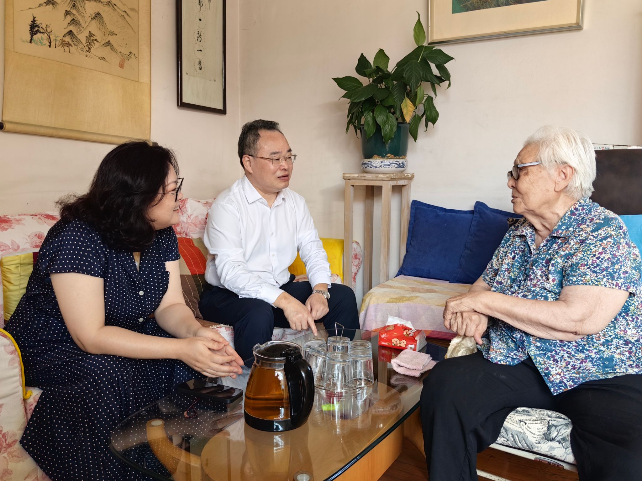 郭庆松与盛老亲切交谈,详细询问其身体状况和生活情况,认真聆听她讲述当年投身抗战的难忘经历和到校工作的情况。盛老对过往的岁月记忆犹新,件件桩桩娓娓道来,每个细节清晰如昨,她坚定的理想信念和无私的奉献精神让在场人员深受感动。
