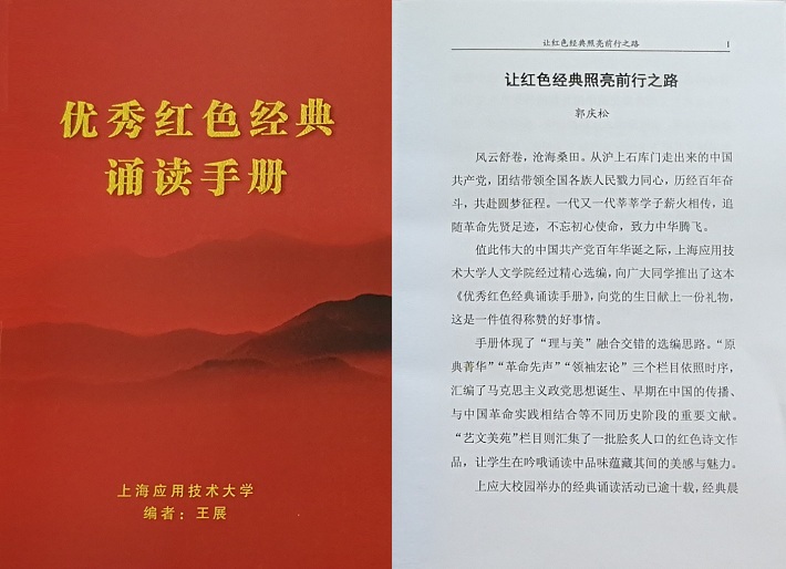 诵读红色经典,致敬建党百年。《上海应用技术大学优秀红色经典诵读手册(修订版)》在会上正式发布。校党委书记郭庆松为本书作序,在序言中寄语上应学子“在人生成长道路上,既要坚持马克思主义基本原理,又要传承中华优秀传统文化,还要弘扬革命文化和社会主义先进文化,让红色基因融入我们的精神血脉,让红色经典照亮我们前行之路。”