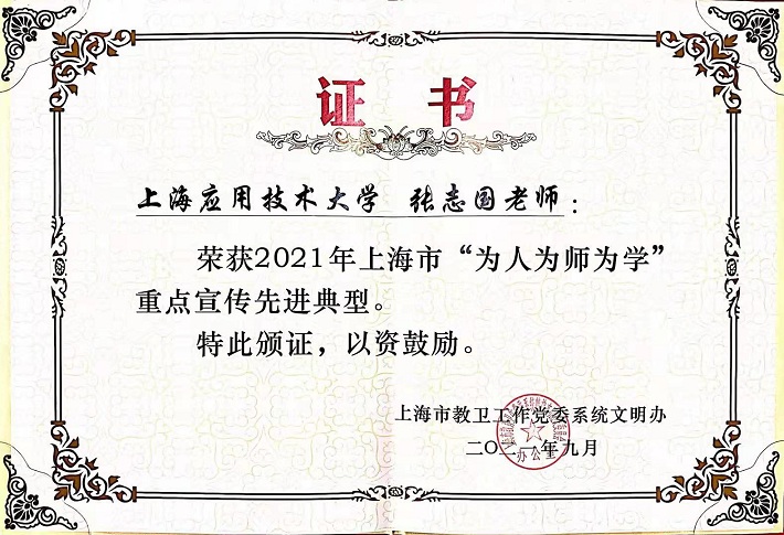 近日,我校张志国教授获评上海市教卫工作党委系统评选的2021年上海市“为人为师为学”重点宣传先进典型。