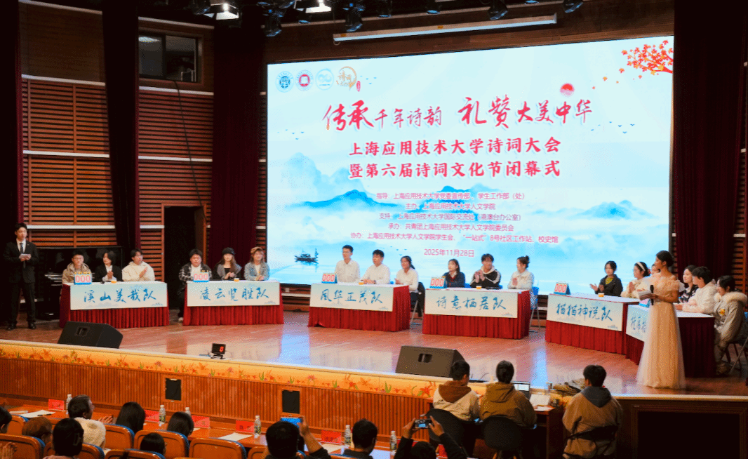11月28日,学校奉贤校区大学生活动中心小礼堂灯火通明,诗意盎然,第六届诗词文化节闭幕式暨诗词大会决赛举行。经过两个多月初赛、复赛的激烈角逐,来自各学院(部)的学子组成六支代表队以诗会友、以词竞智,为全场师生奉献了一场融汇古今、情韵交织的文化盛宴。