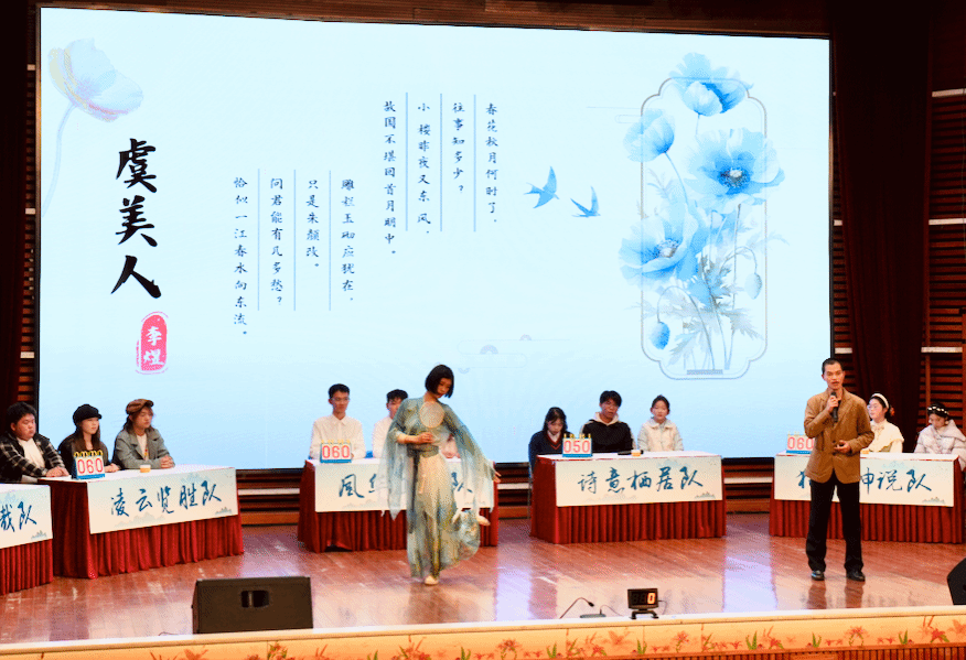 校党委副书记、副校长王瑛,人文学院党委书记周文、院长李正东,校党委宣传部副部长吕客,校团委副书记魏晋,人文学院党委副书记副院长徐津津、副院长肖昕茹,档案馆张永吉以及中国诗词大会学术总负责人、命题专家组组长李定广,上海大学研究生院副院长、诗礼文化研究院执行院长姚蓉,上海公安学院基础部专业基础教研室主任崔磊、中国诗词大会第六季总冠军陈曦骏等特邀评审专家,与各学院(部)师生代表及观众一同见证了这场诗意与才华的交锋。