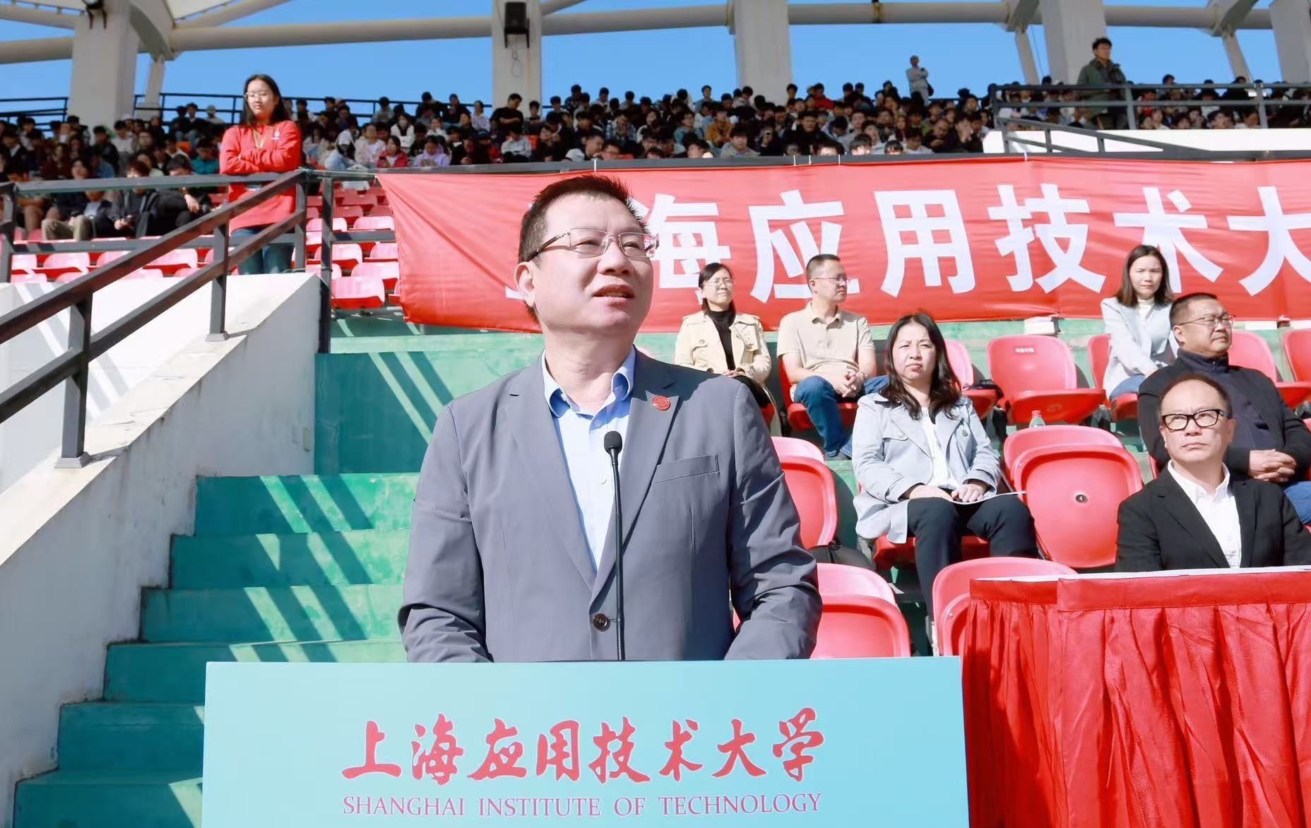 郭庆松宣布上海应用技术大学第十届田径运动会正式开幕!现场礼花绽放、掌声雷动,方队整肃、红旗猎猎。偌大的田径场,处处充盈着欢乐的气氛和澎湃的激情!