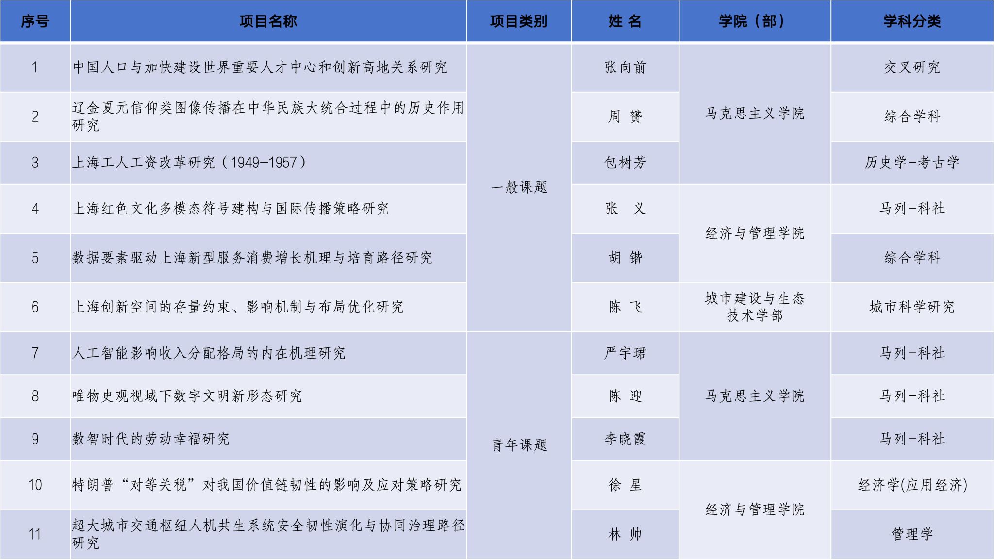 近日,上海市哲学社会科学规划办公室正式公布2025年度上海市哲学社会科学规划项目立项名单,我校共有11项课题成功获批,其中一般课题6项、青年课题5项。立项总数较2024年增加6项,相比“十四五”前四年平均获批数增长158%,实现大幅突破,创历史新高。11项课题覆盖马克思列宁主义和科学社会主义、经济学、管理学、城市科学研究、历史学、综合学科以及交叉学科,充分彰显我校哲学社会科学研究的创新活力。