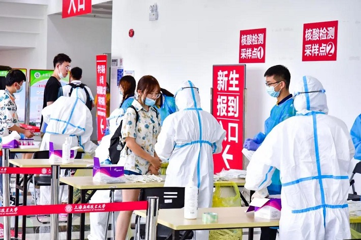 我们在校门口、核酸检测处