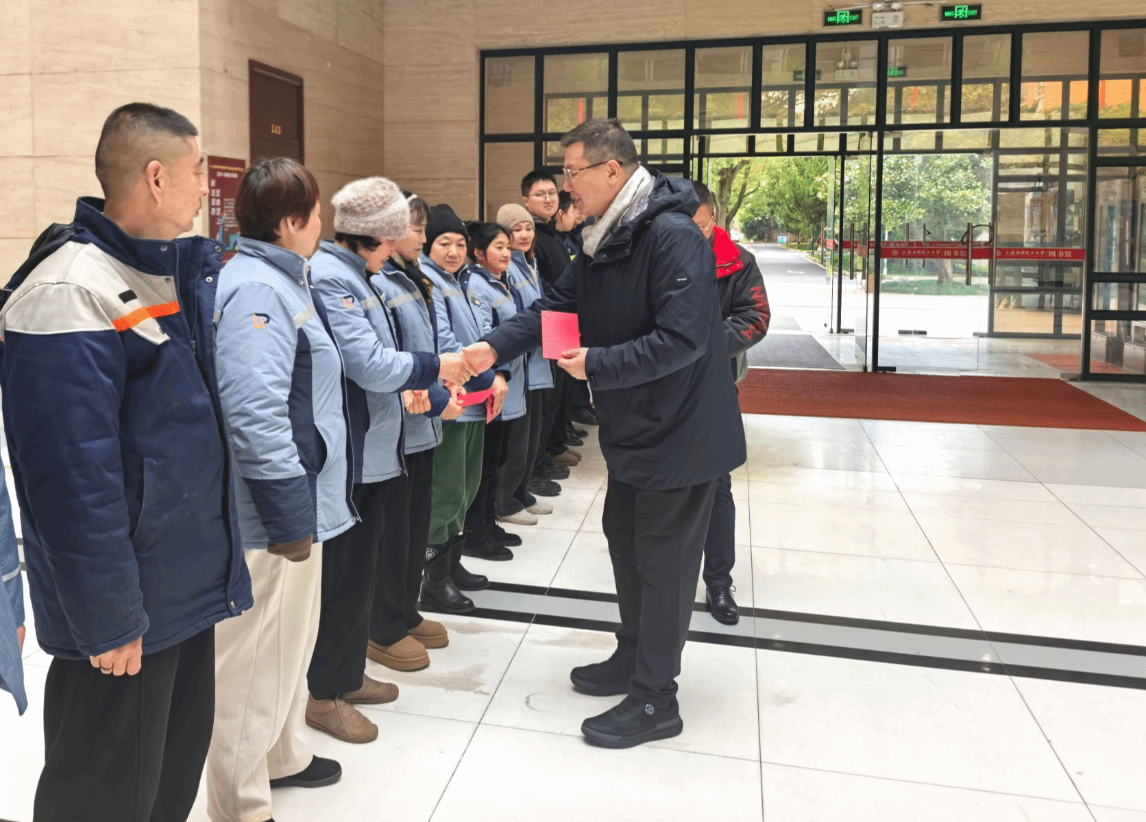 骏马奔腾迎新春,龙马精神启新程!2月17日,农历马年大年初一,校党委书记郭庆松、校长汪小帆分别带队前往奉贤、徐汇两校区,亲切看望慰问春节期间坚守在工作一线的干部职工,向大家致以新春的美好祝福和诚挚问候,代表学校向全体值守人员致以崇高敬意。
