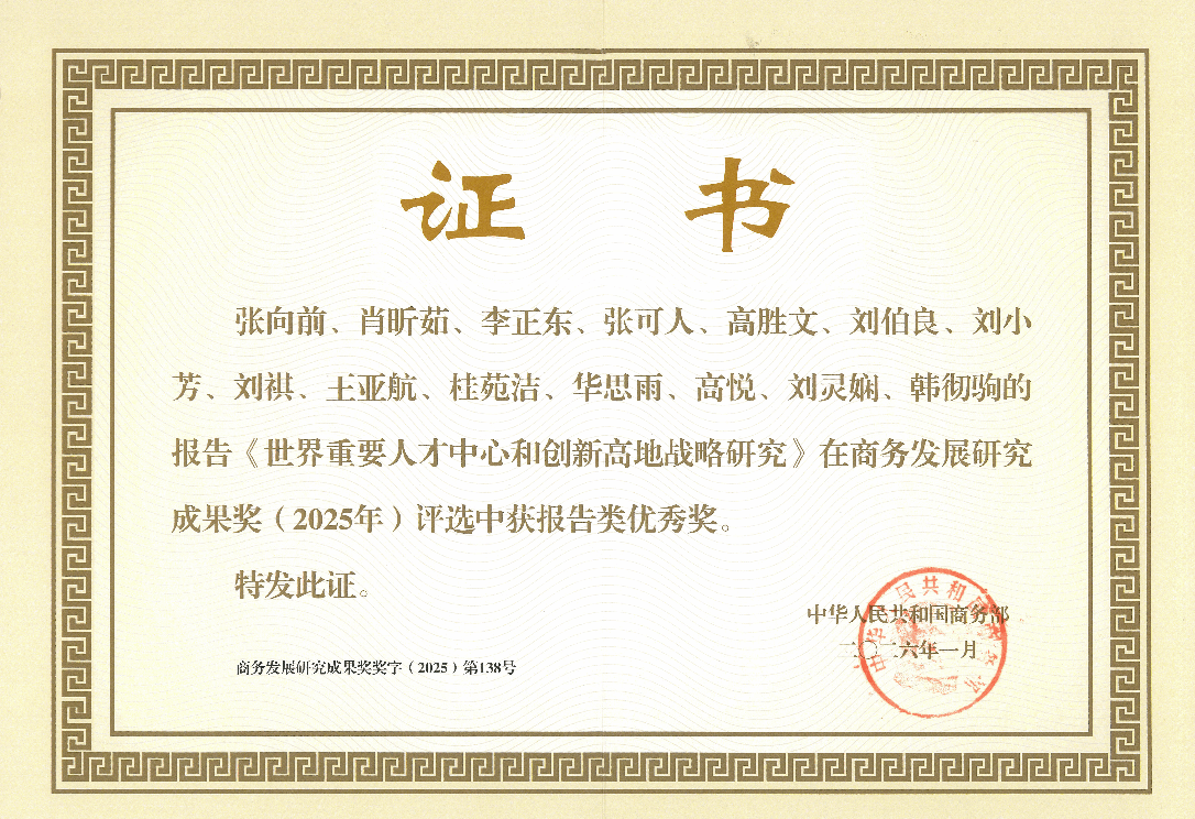 商务发展研究成果奖是我国商务领域唯一的全国性社科类部级奖项,具有重要学术影响力和政策影响力。本次获奖成果聚焦国家人才强国与创新驱动发展核心战略,系统梳理全球人才竞争格局与创新高地演进规律,深入分析我国建设世界重要人才中心和创新高地的机遇挑战,提出具有前瞻性、可操作性的战略路径与政策建议,为国家相关决策提供了重要智力支撑。本次获奖是学院坚持服务国家重大战略、强化智库研究与决策咨询取得的又一标志性成果,充分展现了教师团队扎实的科研能力与服务社会发展的水平。