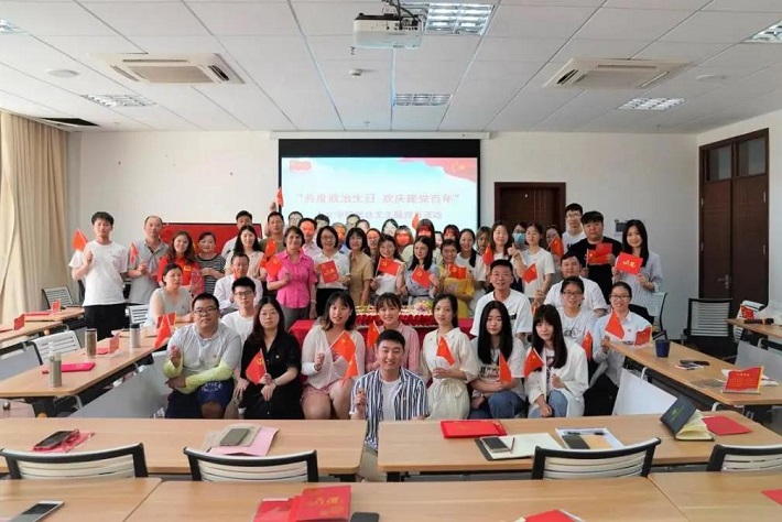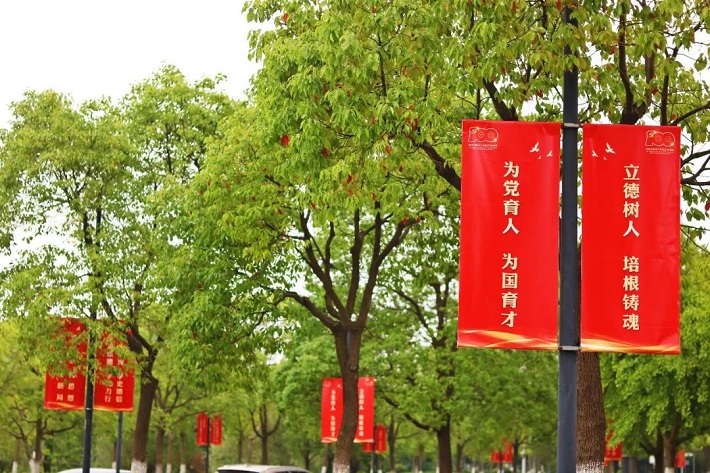 上应校园,“热烈庆祝中国共产党成立100周年”横幅高悬图书馆大楼,