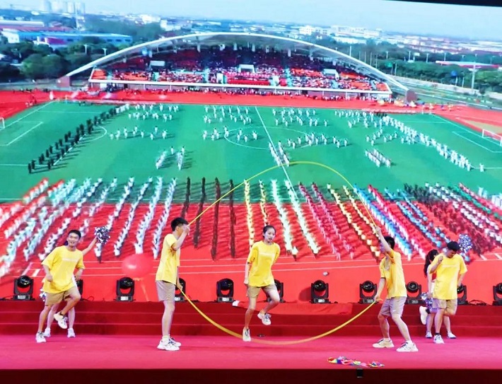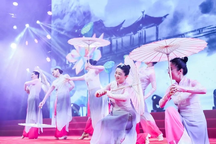 红星如火,百年风禾尽起;碧海飞金,万里轫翅初发。传统艺术舞龙舞狮和滚灯表演之后,材料学院、香化学部、电气学院以《以时代之名》激励学子《不要怕》,勇敢《破浪》。鲁班书院少数民族学生用舞蹈《新时代的春天》表达了五十六个民族对党的忠诚与热爱,高职学院歌曲《我和我的祖国》、外语学院歌舞剧《中国心 跟党走》展现了上应青年爱国、爱社会主义的时代主旋律,凝聚起同心共筑中国梦的磅礴力量。大学生艺术展演一等奖作品舞蹈《碇步桥水清悠悠》、校教工舞蹈大赛二等奖作品舞蹈《烟雨江南》,呈现了学校德智体美融合发展的教学成果。活力四射的健美操《应妳精彩》为即将前行的学子喝彩。