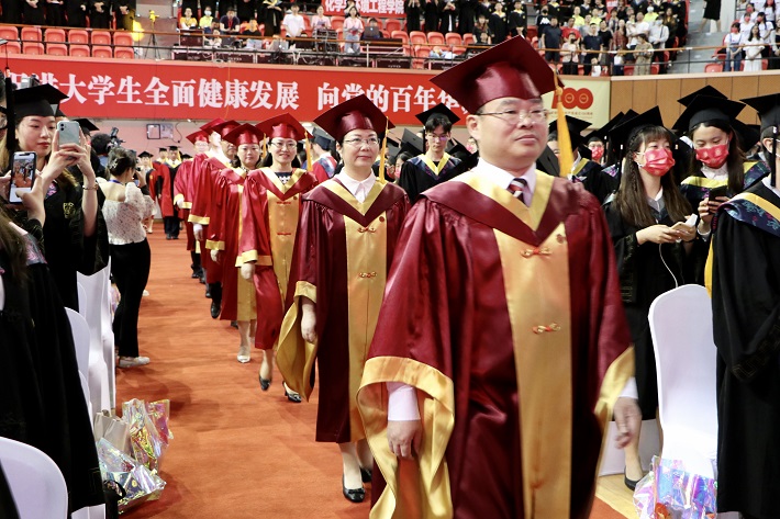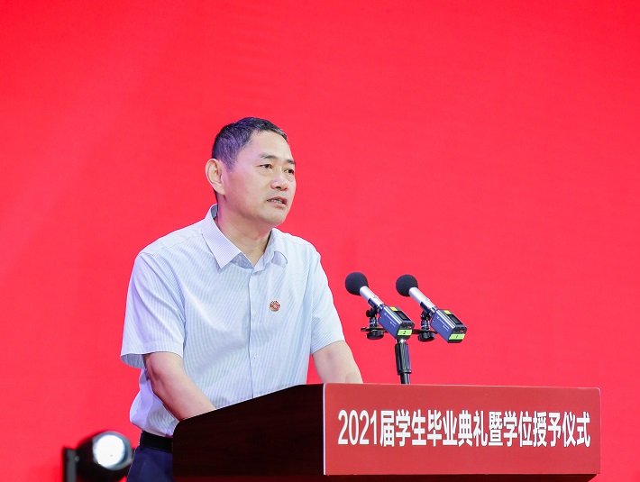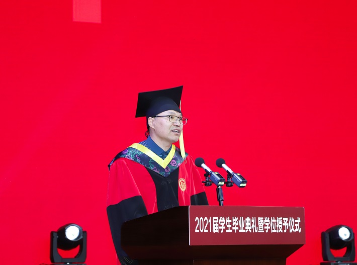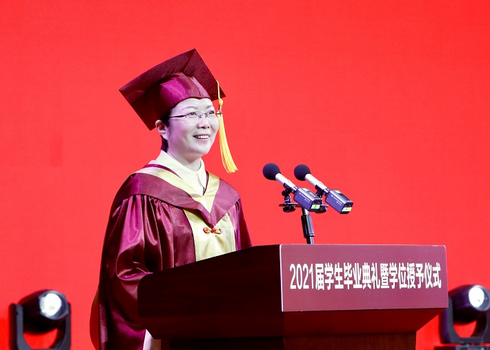 校领导郭庆松、柯勤飞、王瑛、陈海瑾、李健、张锁怀、毛祥东,校学位评定委员会委员、学院负责人、职能部处负责人、教师代表、校友代表和2021届全体毕业生欢聚一堂,共同见证和庆祝这一难忘时刻。校党委副书记、副校长王瑛主持毕业典礼。