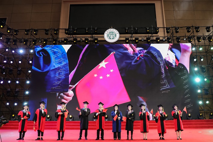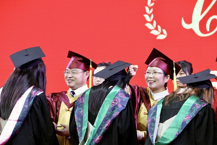 全体校领导及主礼教授上台为优秀毕业生授予学位证书并拨穗正冠。轻轻的拨穗声,是祝贺,也是期待;是告别,也是起航。