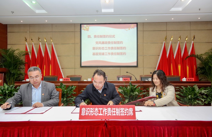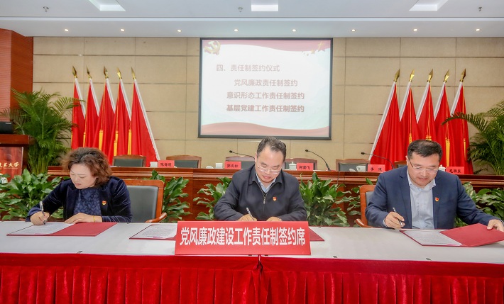 为加强学校全面从严治党主体责任意识,建立健全压力层层传递、责任层层落实、工作层层到位的工作机制,大会举行了签约仪式,郭庆松分别与校领导班子其他成员、机关职能部门、二级学院党组织代表签署了党风廉政建设工作责任制、意识形态工作责任制、基层党建工作责任制责任书。