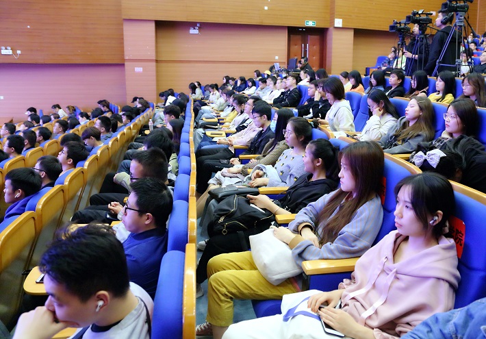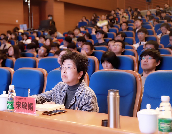 第一堂思政课主会场设置在奉贤校区学生活动中心多功能报告厅,同时,在奉贤和徐汇校区还设立了三个分会场,全校研究生通过网络直播形式同步聆听了授课。