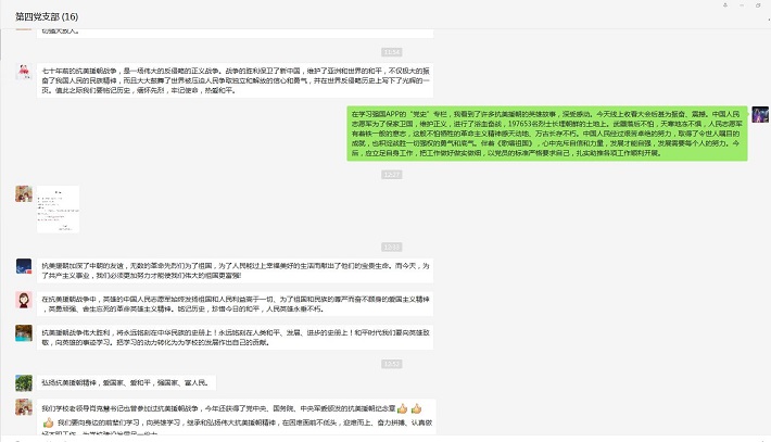 理学院学生吴欣怡等说,作为新时代青年大学生,要时刻铭记抗美援朝伟大历史,弘扬抗美援朝伟大精神;用行动践行爱国主义精神,爱党、爱国、爱社会主义、为人民服务,努力学习,全面发展,奋发成才;要继承和发扬革命先辈们的伟大精神,把祖国建设的更加美好,更加强大!