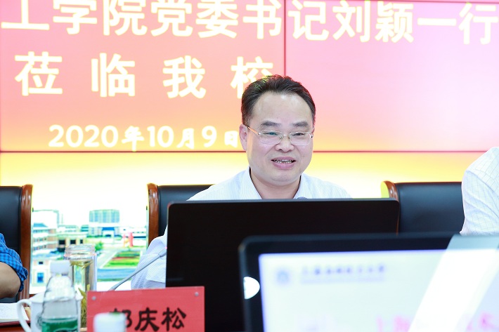 郭庆松简介了我校发展历程,重点介绍了近年来学校办学特色、学科布局、人才培养的工作成绩,以及建设具有国际影响力的高水平应用创新型大学的思路与举措。
