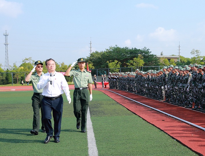 阅兵式正式开始。校党委书记郭庆松在刘国华上校和宋明枫的陪同下检阅了学生方阵。“同学们好!”“书记好!”“同学们辛苦了!”“为校争光!”的口号声此起彼伏,豪情万丈。