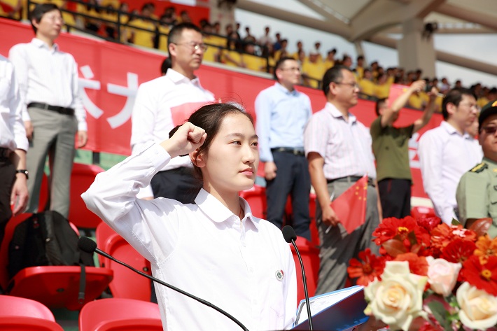 “我是上海应用技术大学学生,我愿以责任浇铸青春年华!厚德精技,砥砺知行。……为实现中国梦而努力奋斗!”在校学生会主席、城市建设与安全工程学院高源同学带领下,全体新生庄严宣誓,从此与上应大真正血脉相连。