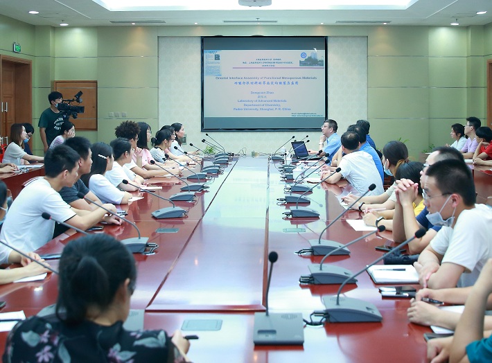 赵东元为我校师生作精彩的学术报告,重点介绍了基于界面组装调控的功能介孔材料。赵东元团队发展了一系列合成多级结构功能介孔材料新方法,包括微乳限域自组装法、液-液界面两相法、挥发驱动定向组装、介孔各向异性生长法、界面驱动定向组装等。他用诙谐、生动的语言讲解了艰深的新型介孔材料的化学生成方法,令现场聆听报告的师生获益匪浅。