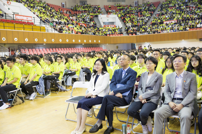 “上海应用技术大学始终与国家同呼吸共命运、与时代同步伐共发展。”郭庆松深情回顾了上应大近70年的建校史,详细介绍了学校近年来在学科建设、人才培养、师资队伍、科学研究等方面取得的突出成绩。郭庆松表示,学校深深扎根中国大地,培养了一大批治国栋梁、业界翘楚、行业先锋,在众多领域产出了一大批优秀学术成果,为推动国家与区域经济社会建设和相关行业发展作出了重要贡献。郭庆松还向同学们展示了“厚德精技 砥砺知行”大学精神等学校精神标识和文化品牌,他表示,学校将继续努力建设环境优美、内涵深厚的校园环境,营造立德树人、追求卓越的校园氛围,让同学们在和谐美丽的校园里成长成才。