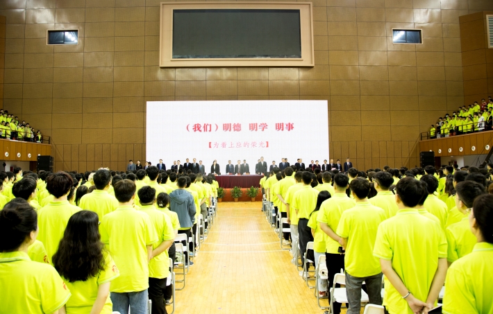 身着新绿色T恤衫的5000余名新生齐聚一堂,体育馆主馆大厅格外明亮。下午13时,全场师生起立,高唱中华人民共和国国歌,五星红旗迎风飘扬,开学典礼正式开始。