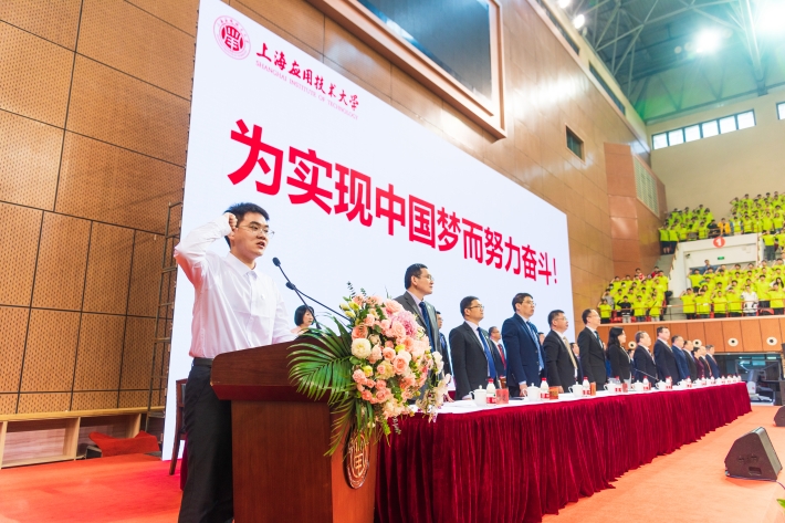 “我是上海应用技术大学学生,我愿以责任浇铸青春年华,厚德精技,砥砺知行,……为实现中国梦而努力奋斗!”在校学生会执行主席、城市建设与安全工程学院陈丹峰同学的带领下,全体新生庄严宣誓。铮铮誓言,是为青春起航吹响的嘹亮号角。