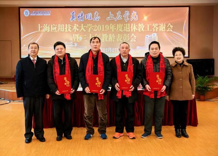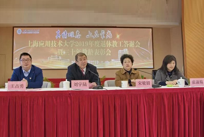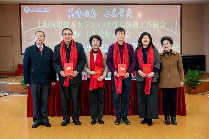 刘宇陆、宋敏娟为每一位退休教职工佩戴如意围巾,并颁发校工会精心制作带有档案卡片的荣退证书。王占勇宣读上海应用技术大学关于授予王慧艺等15位同志三十年教育工作者、方永余等3位同志教育战线工作三十年荣誉称号的决定。张淑梅向退休教职工致答谢词。