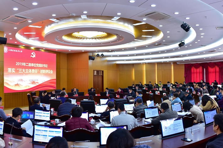 为深入贯彻落实党的十九大、十九届四中全会精神和习近平新时代中国特色社会主义思想,推动全面从严治党向基层延伸,促进学校党的建设各项工作全面进步、全面过硬,根据市委、市教卫工作党委有关要求,校党委于12月27日召开了2019年二级单位党组织书记落实“三大主体责任”述职评议会。校党委书记刘宇陆出席会议并讲话。校党委副书记、校长柯勤飞主持会议。校党委副书记宋敏娟,校党委副书记、纪委书记何星海,校党委副书记、副校长王瑛,党委常委、宣传部长杨明,党委常委、组织部统战部部长王占勇出席会议。上海大学党委常委、组织人事部副部长、组织处处长张洁,上海海事大学党委宣传部部长杨大刚,我校纪委原副书记赵增绶等校内外专家应邀出席会议。我校全体党委委员、二级单位党组织书记、专职组织员和党支部书记代表参会。