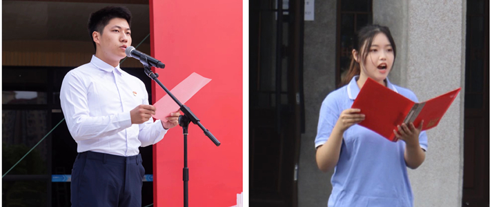 化工学院学生代表陈天啸和艺术学院学生代表曹滢颖作“国旗下的演讲”,他们向伟大祖国送上最真挚的祝福,表示要立志做有理想、敢担当、能吃苦、肯奋斗的新时代好青年,展现了上应学子自信自强、刚健有为的精神风貌。艺术学院特教班同学带来了真挚深切的国歌手语表演,表达了内心深处对伟大祖国的深沉热爱。