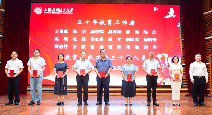 “韶华青春三十年,扎根教育守初心。喜看上应今昔变,桃李芬芳花满园。”从教30年教师代表、生态技术与工程学院党总支书记曹扬教授深情诉说了从教30年教师们的共同心声,表达了对学校30年教诲与培养的诚挚感情。获奖教师代表、上海市五一劳动奖章和上海市科技进步一等奖获得者、科学技术研究院院长韩生教授在感言中表示,要争做脚踏实地的“善梦者”,竭尽所能引导学生成为“追梦者”和“筑梦者”,为加快建设教育强国贡献自己的力量。