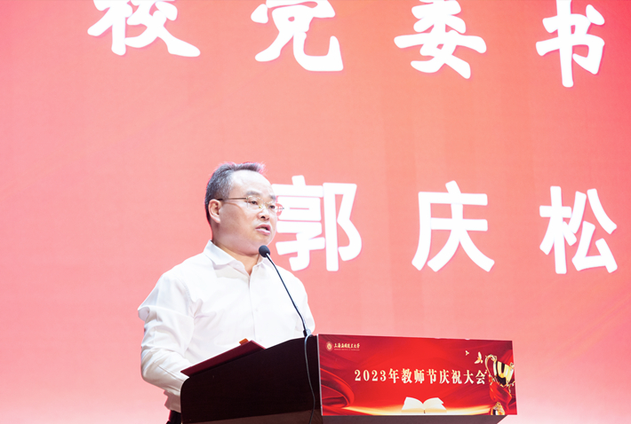 郭庆松在讲话中向辛勤耕耘、默默奉献的全校教职工致以节日的问候和崇高的敬意,向受到表彰的优秀教师表示热烈祝贺,向已从教30年的教师和离退休老教师表示衷心感谢,向近期加入上应大家庭的新教师表示诚挚欢迎!